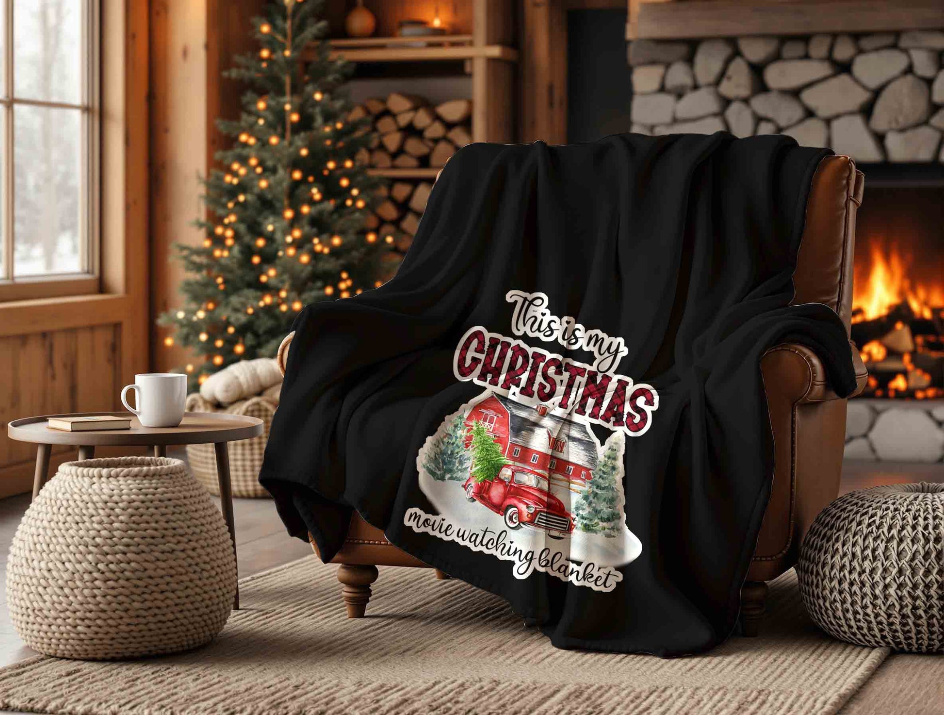 Design: βThis is my Christmas Movie Watching Blanketβ with a festive farmhouse scene